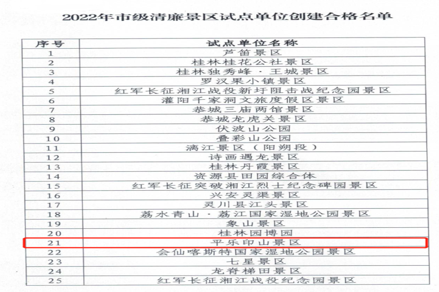 凭据《桂林市清廉景区(试点、示范)评定实施步伐(试行)》和《关于开展清廉景区评审暨绩效考评事情的通知》要求,平乐弘润公司印山旅游码头景区通过相关评定流程,乐成入选2022年度市级清廉景区示范单位...
