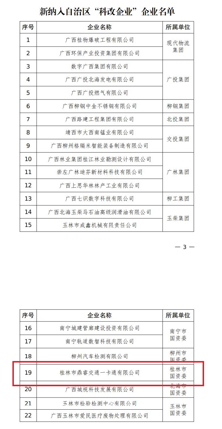 近日,为全面落实国有企业革新深化提升行动各项要求,推动更多企业通过“科转业动”深化市场化革新,自治区国资委宣布了关于充分扩围自治区“科改企业”的通知,并宣布了新纳入“科改企业”企业名单,桂林BG大游集团下属的鼎睿交通一卡通有限公司榜上有名,获批纳入自治区 “科改企业” 企业名单。
