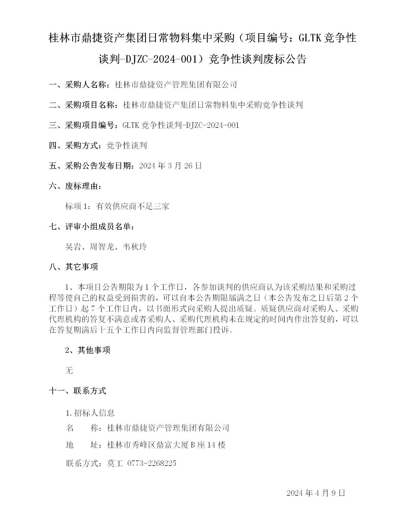 桂林市鼎捷资产集团日常物料集中采购(项目编号:GLTK竞争性谈判-DJZC-2024-001)竞争性谈判废标通告