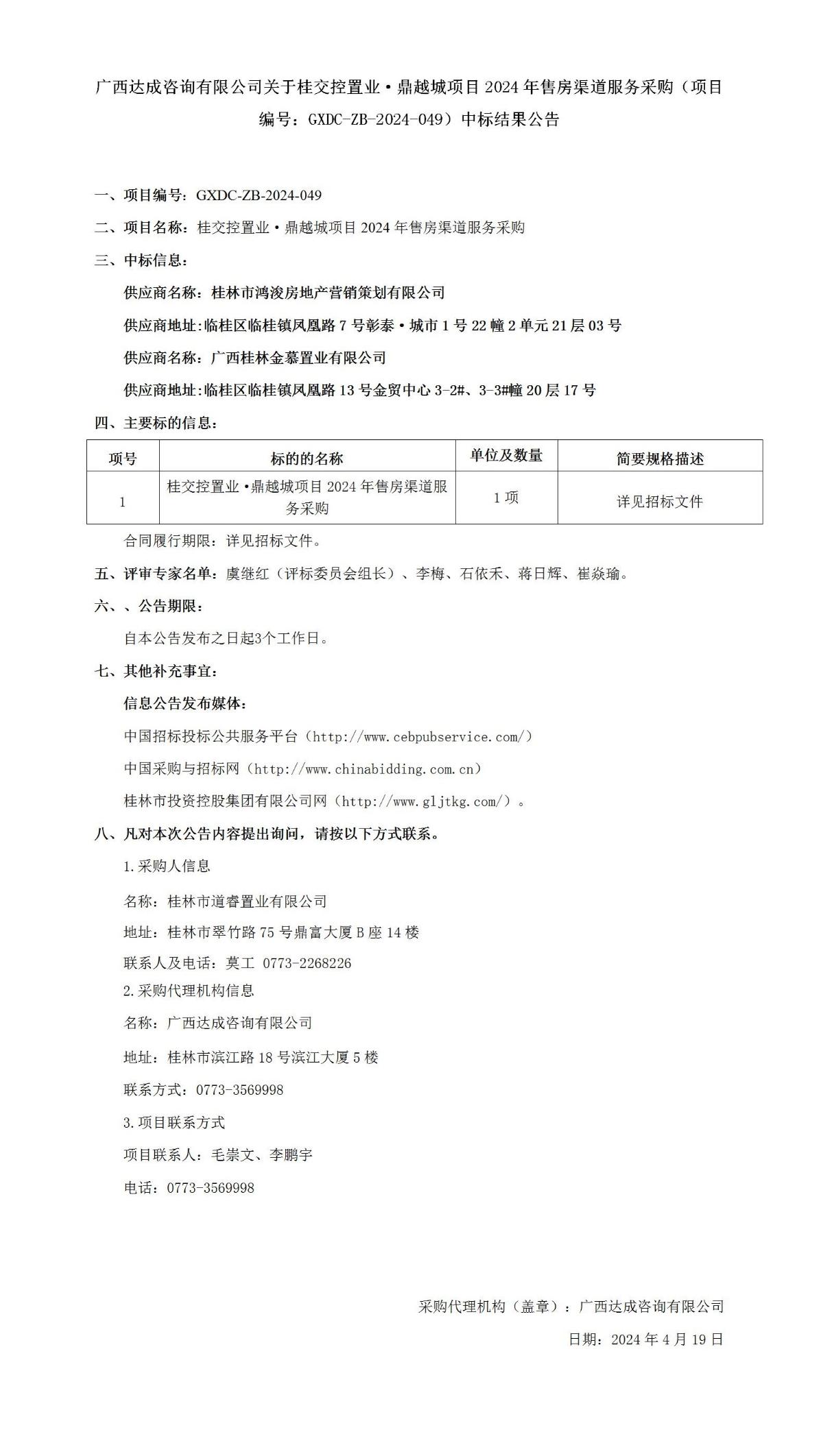 广西告竣咨询有限公司关于桂交控置业·鼎越城项目2024年售房渠道效劳采购(项目编号:GXDC-ZB-2024-049)中标结果通告